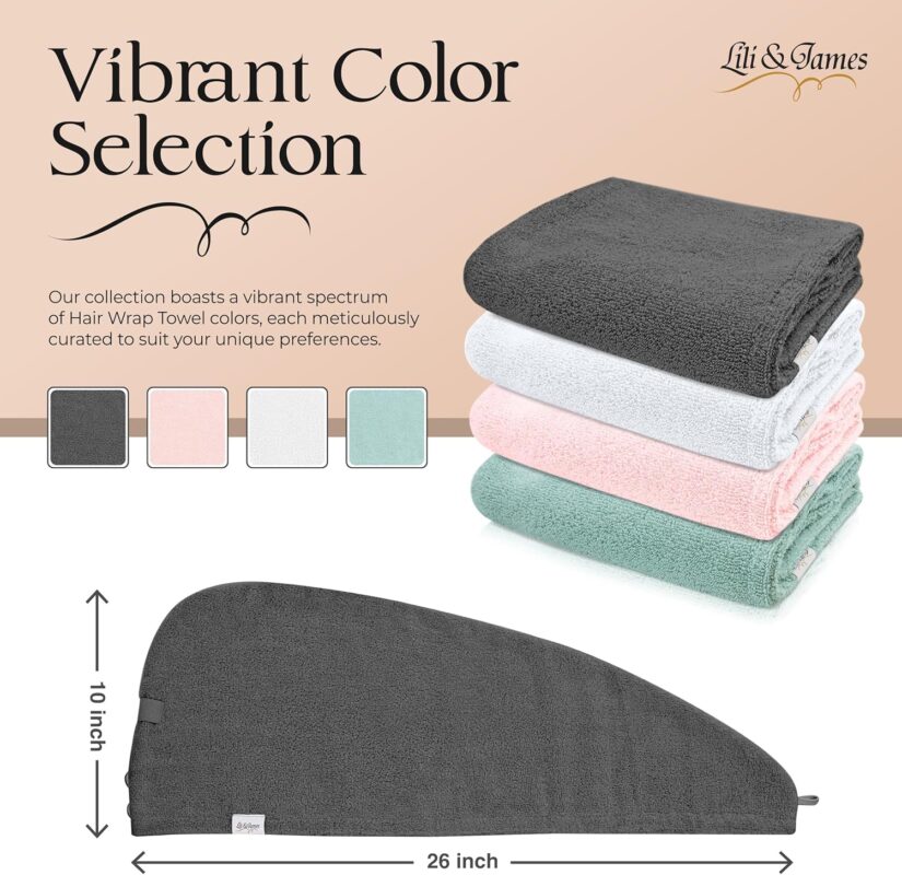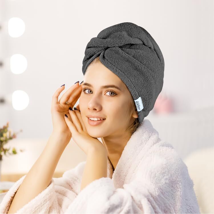 Lili&James 100% Cotton Hair Towel Wrap Quick Dry Super Absorbent Turban Head Wrap for Women/Kids/Men with Double Button, Anti Frizz, Hair Cap for Curly, Long & Thick Hair (Dark Grey)