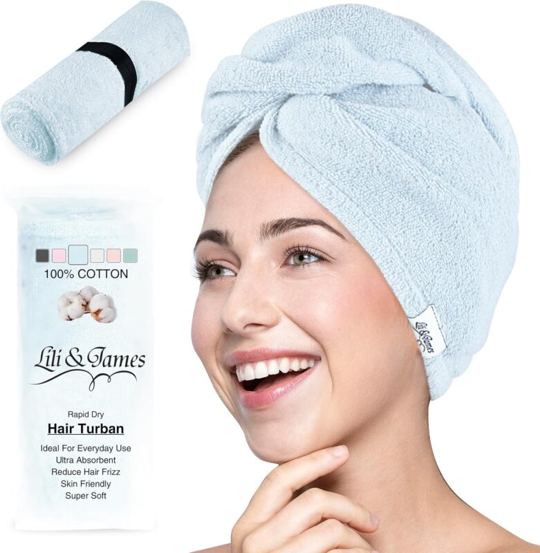 Lili&James 100% Cotton Hair Towel Wrap for Women/Kids | Quick Dry, Soft & Absorbent 420-GSM Hair Wrap Towels with Double Button | Anti Frizz, Non Microfiber Hair Turbans for Curly, Long Hair (Blue)