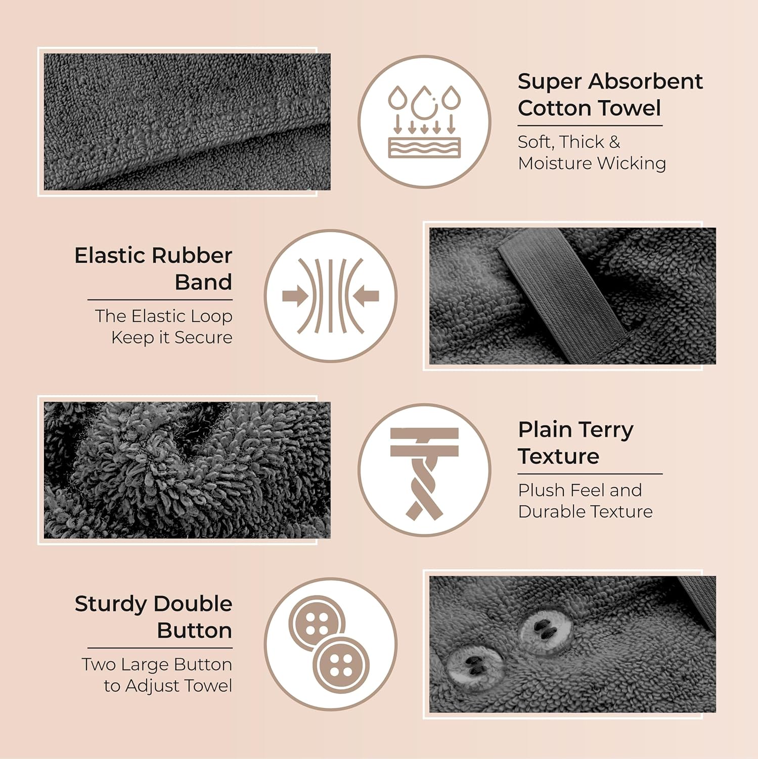 - 💡 𝐋𝐈𝐆𝐇𝐓𝐖𝐄𝐈𝐆𝐇𝐓, 𝐃𝐔𝐑𝐀𝐁𝐋𝐄 & 𝐍𝐎𝐍-𝐒𝐋𝐈𝐏 𝐃𝐄𝐒𝐈𝐆𝐍: Designed with a strong elastic strap + secure button loop, this towel wrap stays firmly in place while you move. No slipping, no readjusting — perfect for morning routines, gym, travel, or work-from-home.